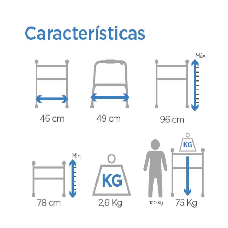 Fabricado en aluminio ligero y resistente, este caminador es plegable y graduable en altura, lo que lo convierte en una opción práctica para uso domiciliario, clínico y hospitalario. Su estructura ergonómica facilita la movilidad y aporta confianza en cada paso, favoreciendo la autonomía del usuario.